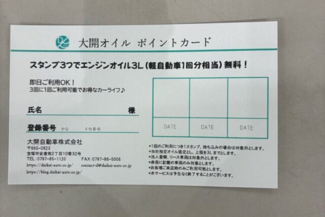 オイルスタンプカードができました。オイル交換1回につき、スタンプ1個押させていただきます 3回オイル交換していただけると、3回目はオイル3L無料になる為、軽自動車は無料になります 3回目は、普通車の場合約1000円でオイル交換ができます。(...