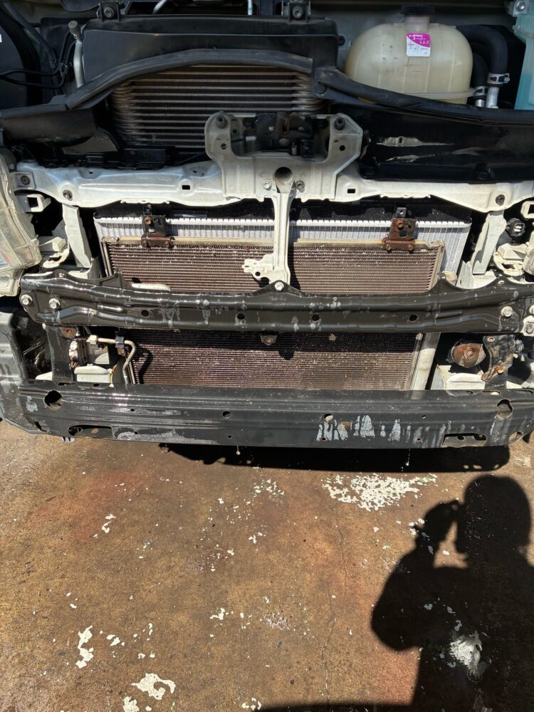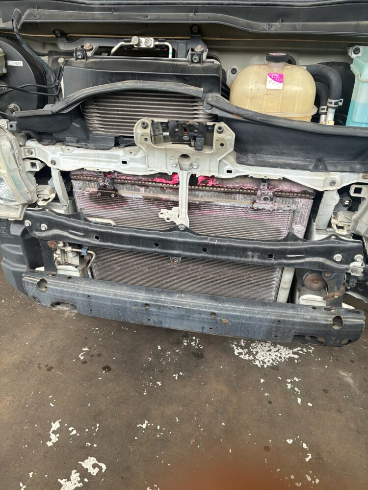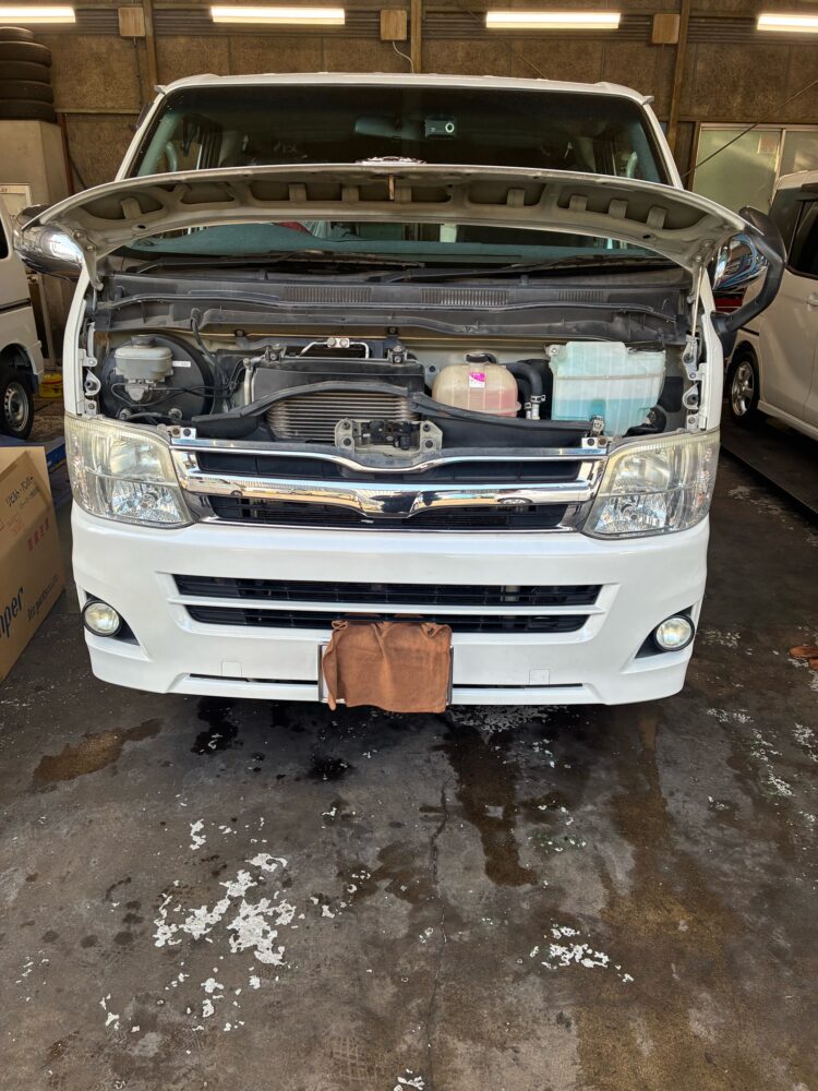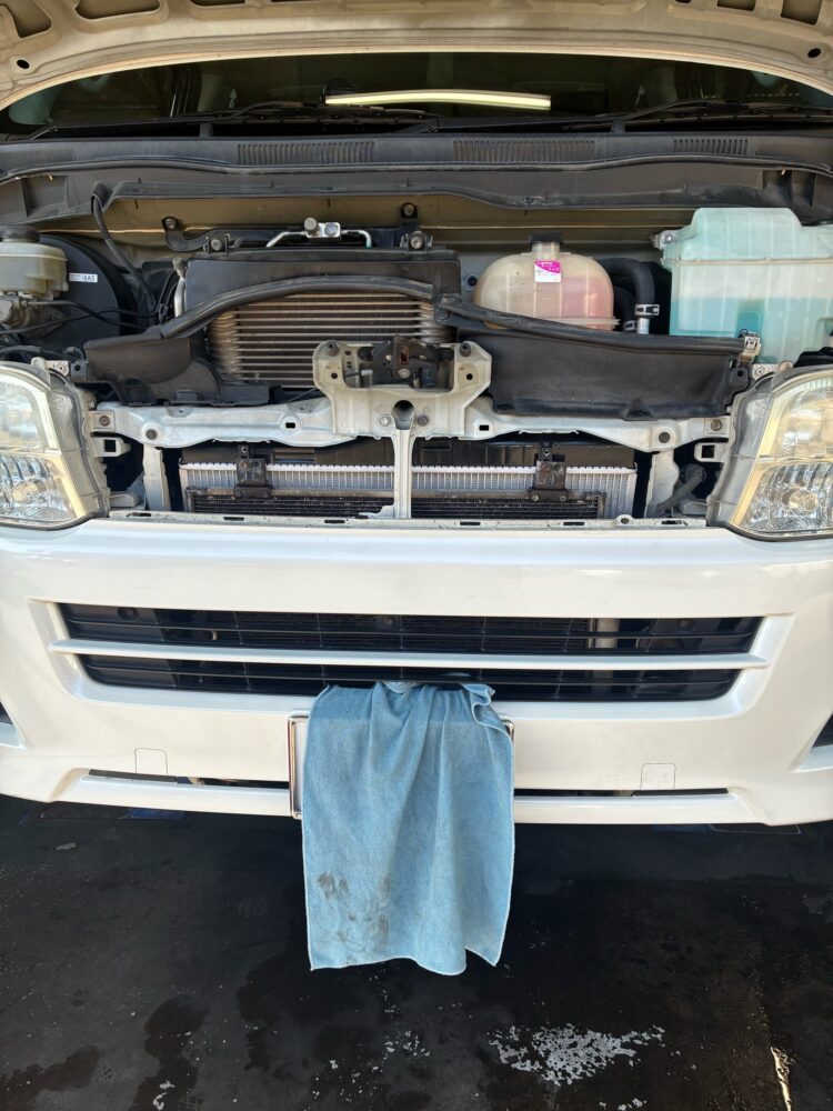 早速点検すると、ラジエターのアッパータンク部分が割れており、水漏れしていました。ハイエースの場合ラジエターのこの部分はよく漏れていると思います。バンパーを外した方が、交換時間が早い為、バンパーを外して作業しました。