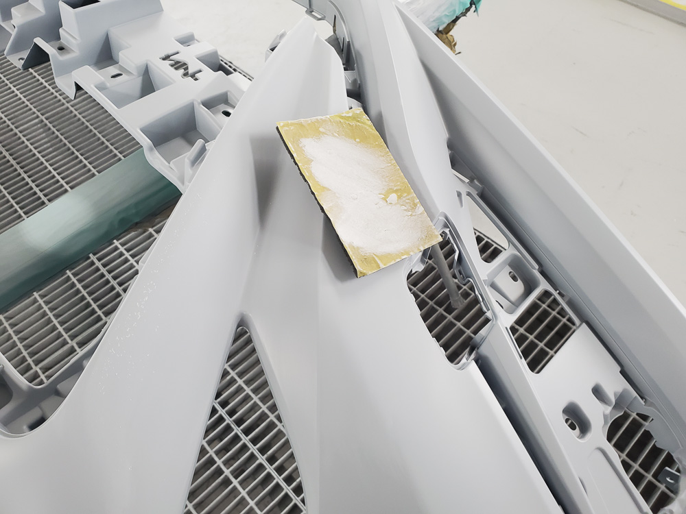 足付け処理をおこないます。塗料の載りを良くするために、表面に細かい傷をつける作業です。